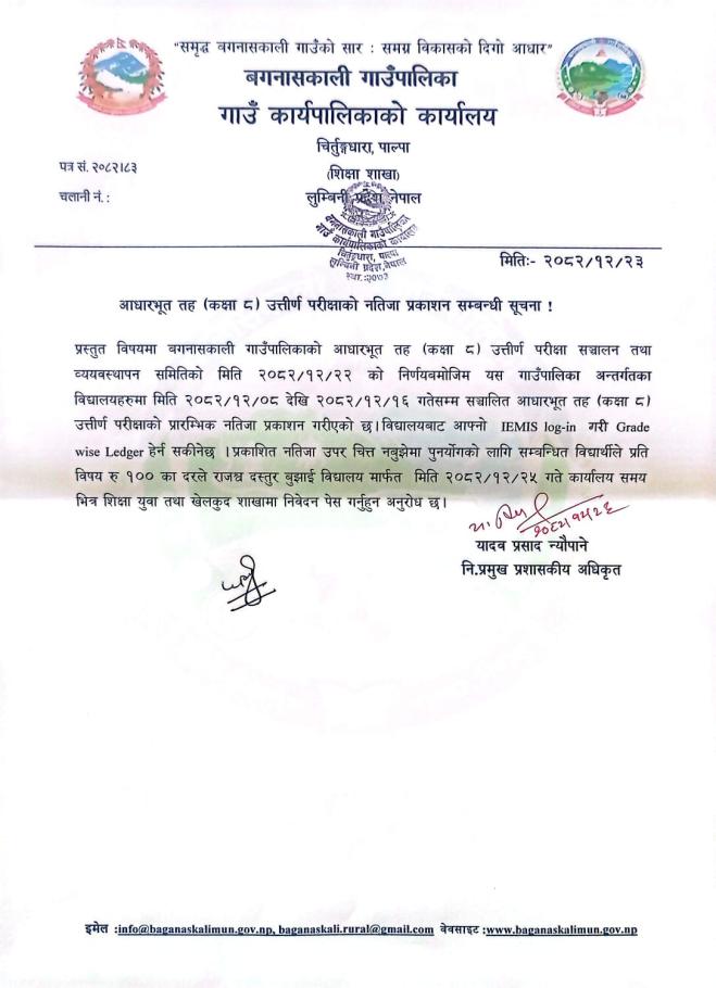 आधारभूत तह (कक्षा ८) उत्तीर्ण परीक्षाको नतिजा प्रकाशन सम्बन्धी सूचना ।