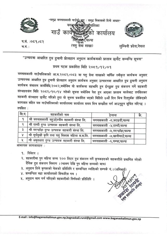उत्पादनमा आधारित दुध ढुवानी प्रोत्सहान अनुदान कार्यक्रमको प्रस्ताव छनाैट सम्बन्धी सूचना ।