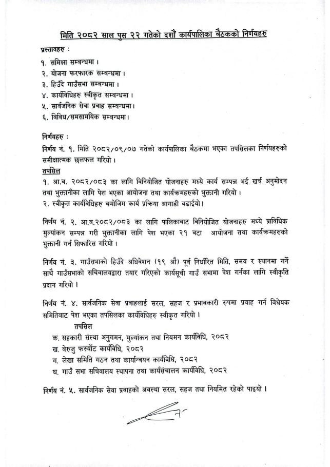 Home » मिति २०८२ पुष २२ गतेको दशाैं कार्यपालिका बैठकको निर्णयहरू
