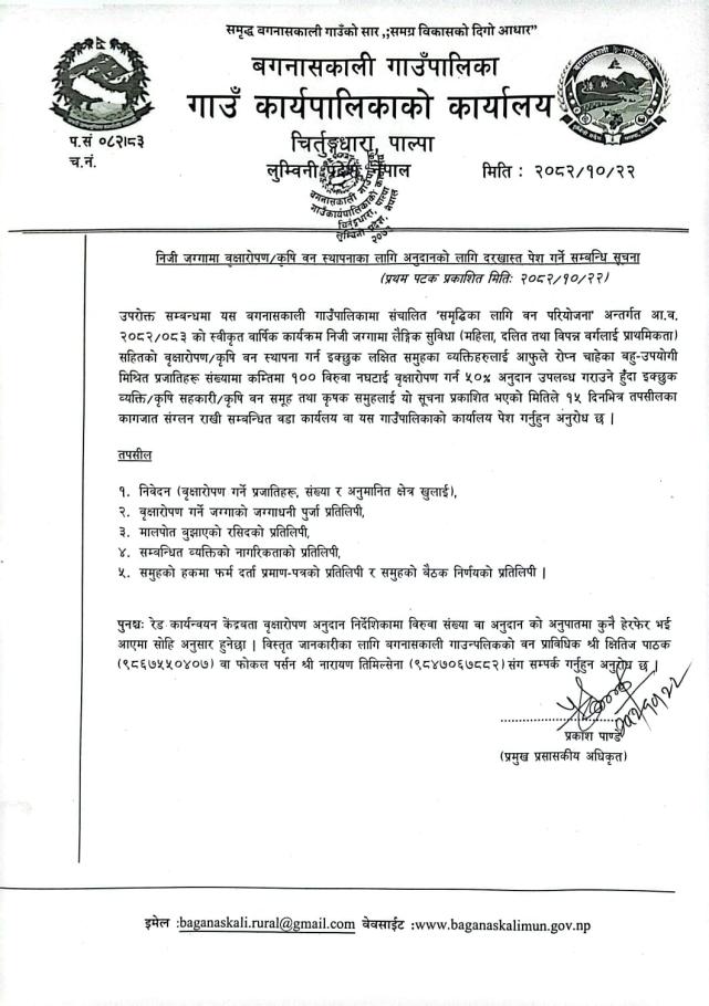 निजी जग्गामा वृक्षारोपण/कृषि वन स्थापनाका लागि अनुदानको लागि दरखास्त पेश गर्ने सम्बन्धी सूचना ।