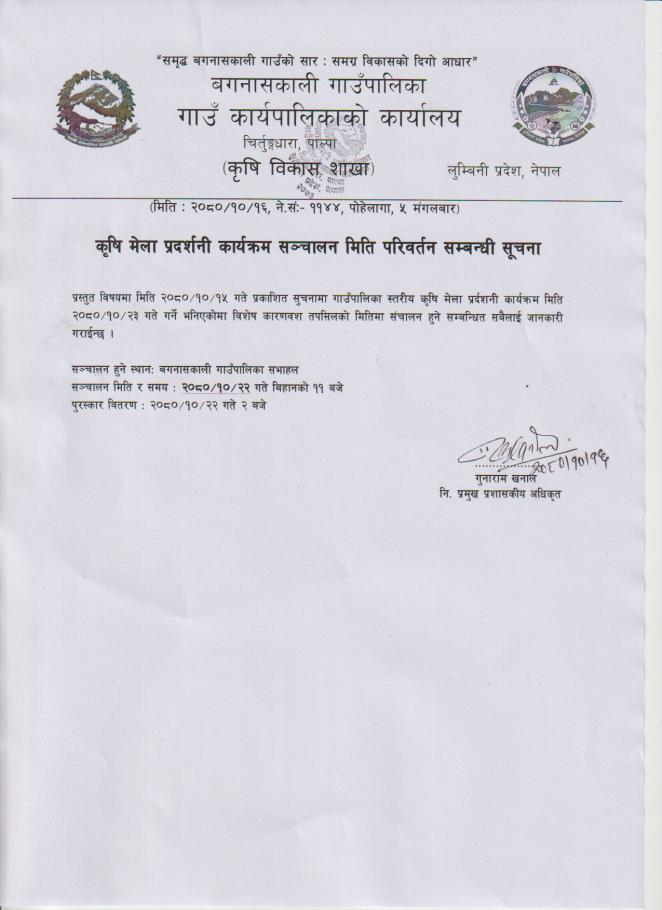 गाउँपालिका स्तरीय कृषि मेला प्रदर्शनीको मिति परिवर्तन सम्बन्धी सूचना