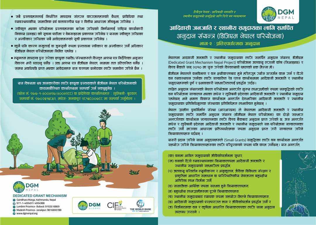 नेपाल ग्रामीण पुननिर्माण संस्था (Rural Reconstruction Nepal- RRN) द्वारा संचालित डिजिएम नेपाल (DGM Nepal) परियोजनाले वन तथा कृषि वनमा आधारित साना र लघु उद्यम विकास र प्रवर्द्धनका निम्ति प्रतिस्पर्धात्मक अनुदानको लागि आशय पत्र सहित आवेदन पेश गर्ने सम्बन्धी
