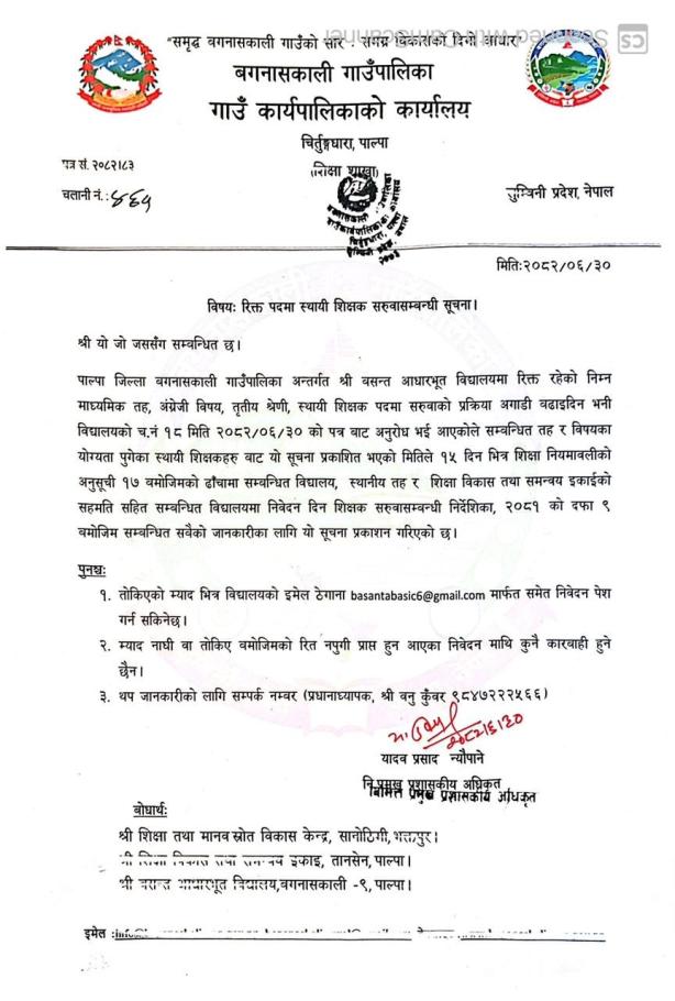 रिक्त पदमा स्थायी शिक्षक सरुवा सम्बन्धी सूचना ।