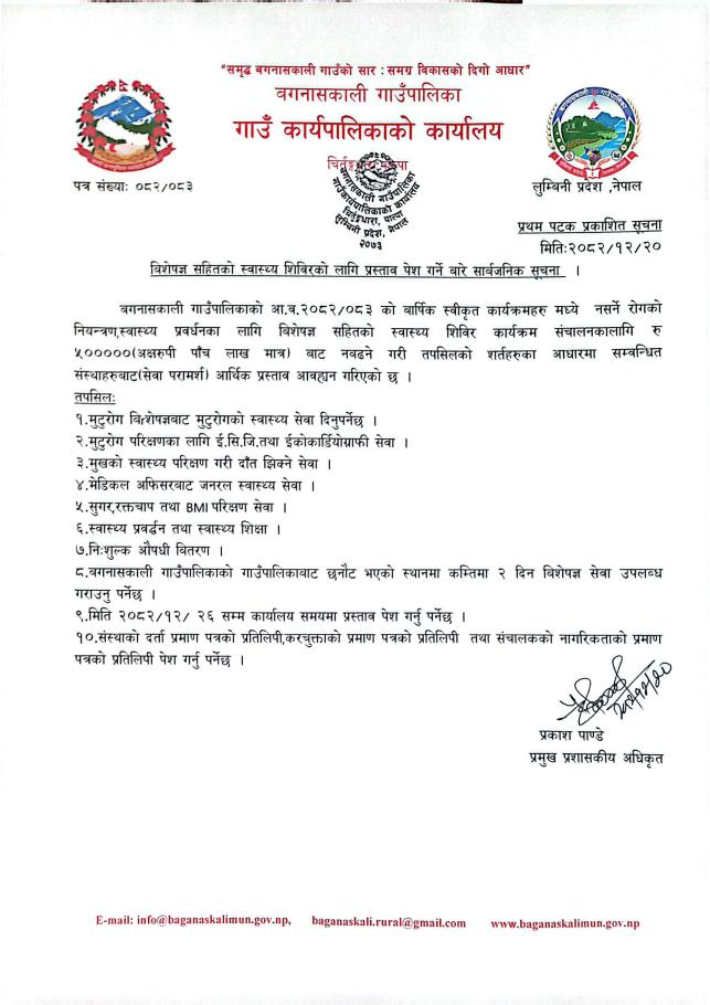 विशेषज्ञ सहितको स्वास्थ्य शिविरको लागि प्रस्ताव पेश गर्ने बारे सार्वजनिक सूचना ।
