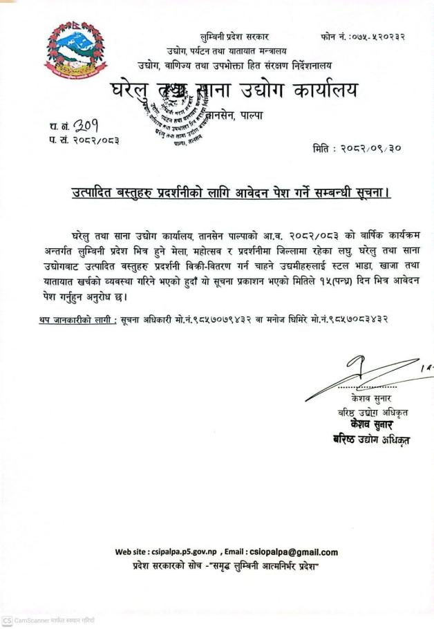 घरेलु तथा साना उद्योग कार्यालय पाल्पाकाे सुचना।।